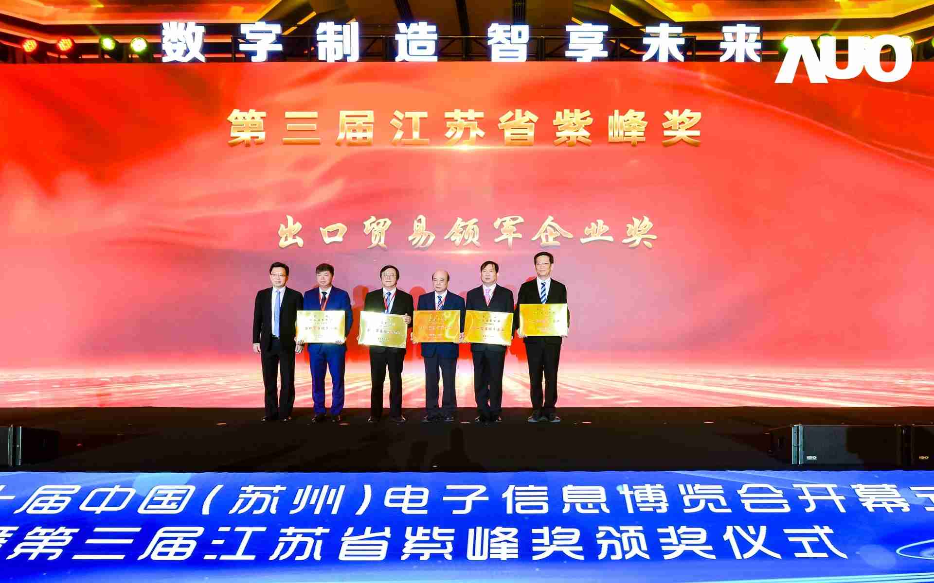 电博会开幕式当天也是第三届江苏省紫峰奖颁奖仪式,,,,省台办、、工信厅、、、、商务厅、、、、苏州市相关领导均出席并颁奖。。。该奖项为表彰对江苏高质量发展做出积极贡献的在苏企业,,,,由江苏省政府专门设立。。彩霸王光电 (苏州) 总经理郭振明代表上台领奖,,,,这也是彩霸王苏州连续三次蝉联紫峰奖 出口贸易领军企业奖。。。彩霸王数位总经理赵丽娜女士,,,,也参与本次开幕式,,,上台为本地化赋能签署战略合作协议,,,,将优质服务资源集合、、、、下沉到更多细分行业,,为更多地区的制造企业提供数字化转型服务。。