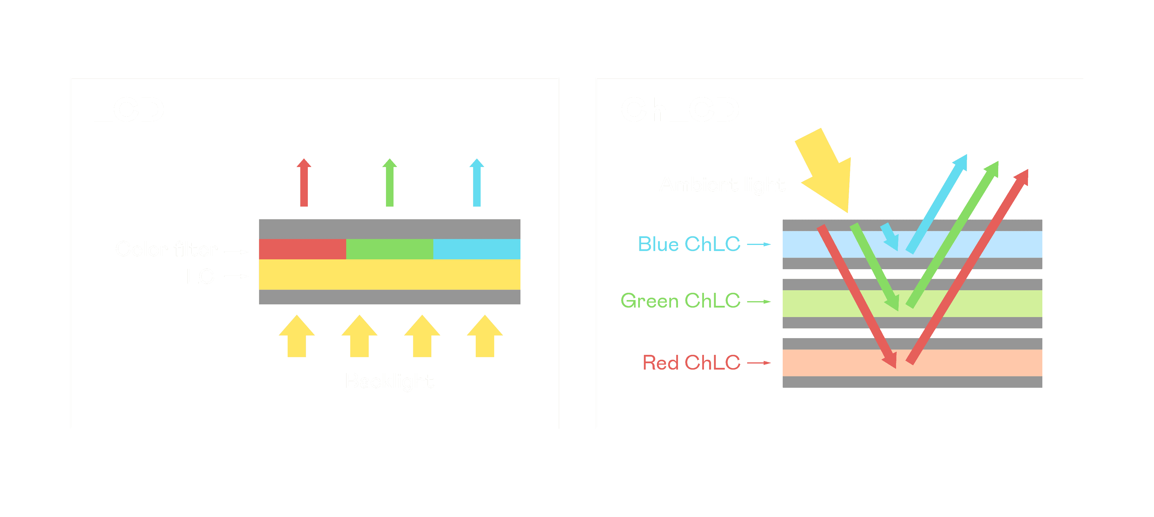 ChLCD 胆固醇液晶就如同纸张一样,,,透过反射环境光来显示影像,,,,因此长时间观看不易造成人眼视觉疲劳,,可达到护眼效果。。。当处于户外阳光下使用,,,LCD 影像容易失真而不易观看,,但胆固醇液晶仍可维持较佳的影像品质。。