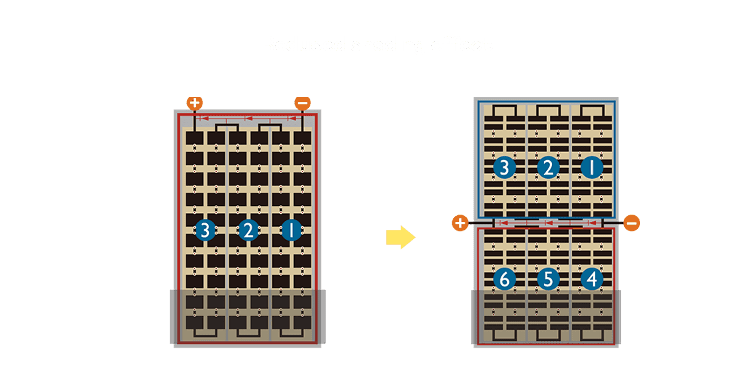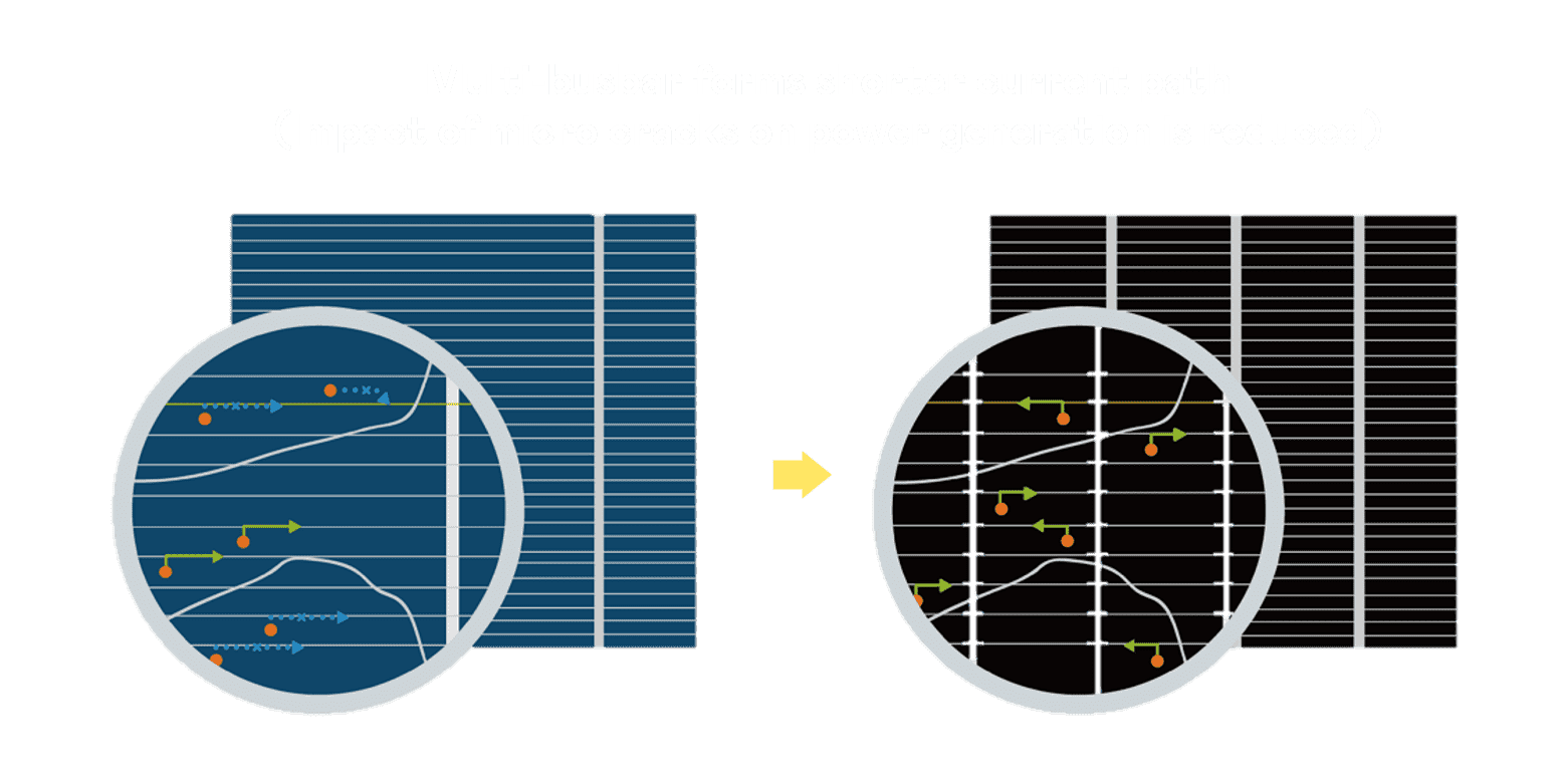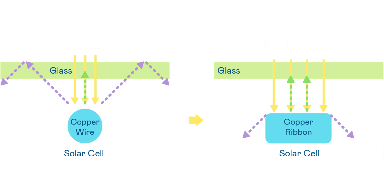 - 电池使用多条铜导线 (Copper wire) 于电池片上形成较短的电流路径,,,,提高电流收集效率,,,,采用圆形设计的铜导线较传统扁平式的铜焊带 (Ribbon),,可增加入射至电池的光线量。。