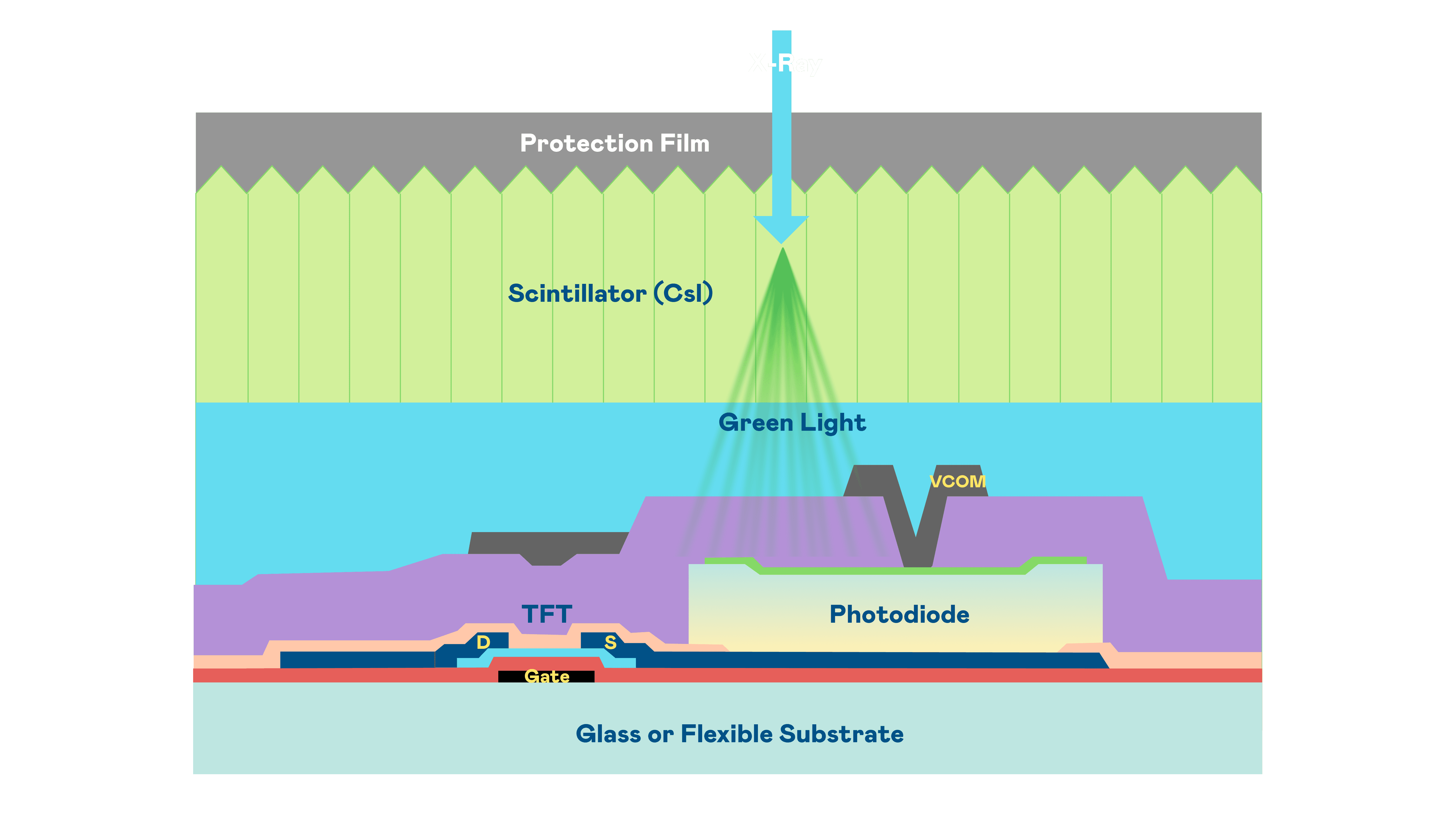 彩霸王的X光影像感测阵列使用薄膜电晶体 (TFT) 作为每个像素的读取开关,,,搭配光电二极体(Photodiode)的光电转换元件,,,,用以感测X光影像讯号。。